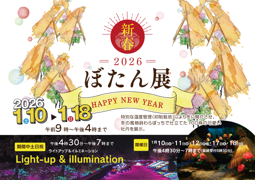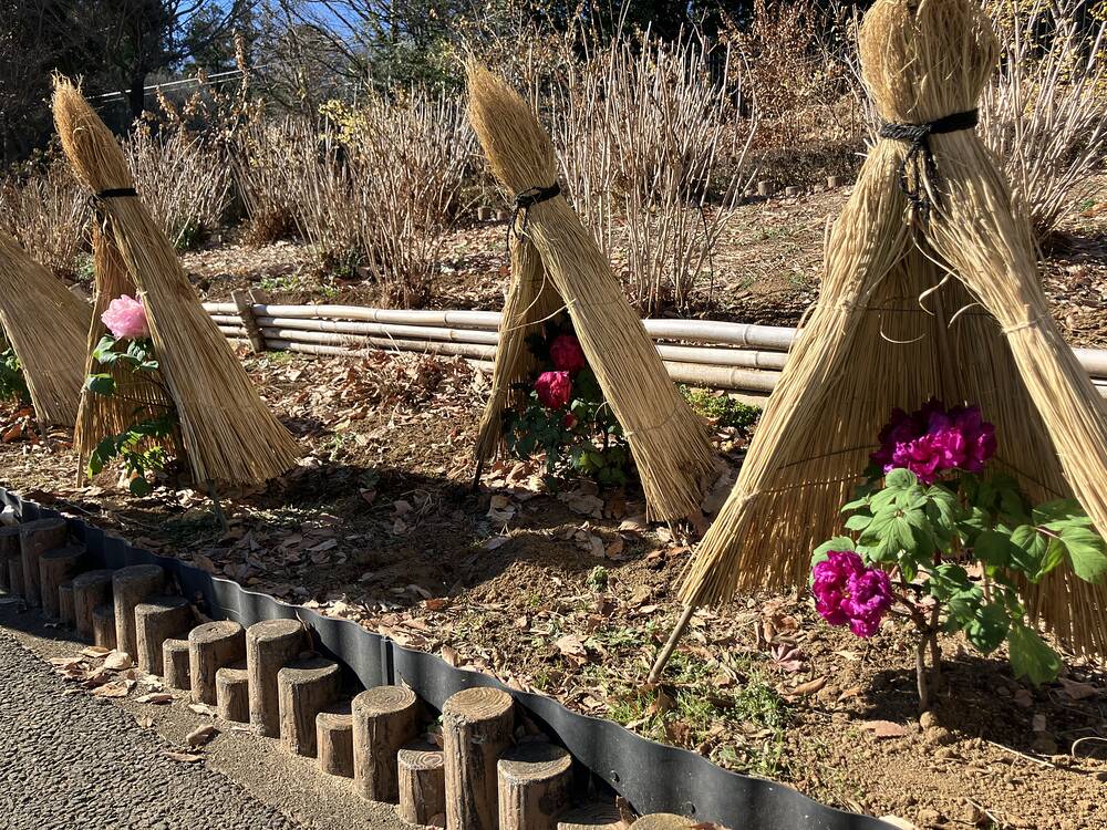 園内では昨年よりもスケールアップし、約100株の藁ぼっちを被せた可憐なボタンをご覧いただけます。